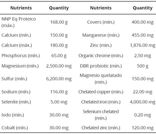Table 1: Guarantee levels per kg of protein mineral supplement of Nellore heifers treated with artificial insemination of a fixed time (AIFT)