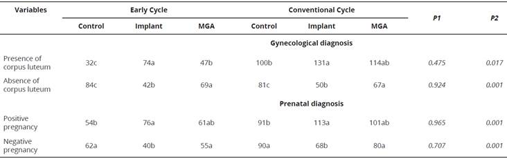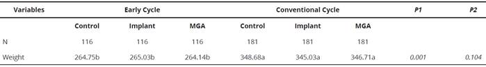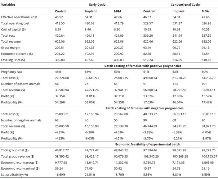 Thus, the results of average batch profitability with implant induction were superior to that with the MGA (18.70%) and control (16.69%) treatments for the early-cycle animals. This was observed for animals in the conventional cycle and animals with implant induction, with above average profit per batch.