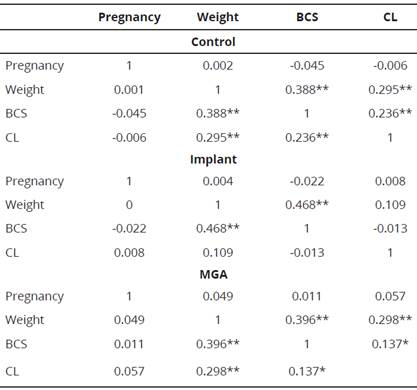 Table 4: Pear correlation between the average weight in kg (weight), body condition score (BCS), diagnosed presence of corpus luteum (CL), and diagnosis of pregnancy (Pregnancy) of nulliparous females submitted to follicular and AIFT inductions