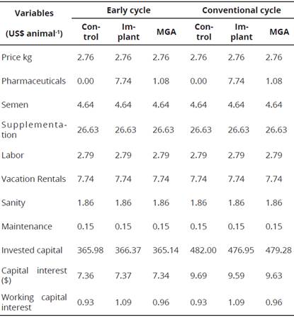 Regarding the production cycles, the profitability of the early-cycle animals was 12.61% higher than that of conventional-cycle animals. Therefore, the use of females aged 16-18 months in AIFT under conditions of forage and supplementation that are equivalent to the requirement of their nutritional needs provides a higher remuneration of capital for agricultural enterprise not only when the short cycle of livestock is used, when the animals for sale stay for a short time in the property. Thus, the definition of production and reproduction objectives involves establishing strategies for the rational use of breeding biotechnologies to determine the economic return of livestock activity at short time. Hormone therapy, when appropriately applied, contributes to increased reproductive efficiency and a favorable cost-benefit ratio to the producer (Sá Filho, 2007).