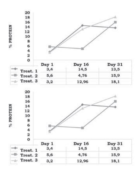 Additionally, statistical differences in protein content of micro silos were found (P < .05) between treatments, time and interaction, finding a value of ca. 4.0 % at the beginning of the experiment. Moreover, this value increased linearly over time (Figure 1), showing a higher increase in protein content for the treatment where kumis was applied on day 31; likewise, a better protein content overall was observed for the two treatments with additives (EM and kumis, i.e. 15.9 and 18.1 %, respectively).
