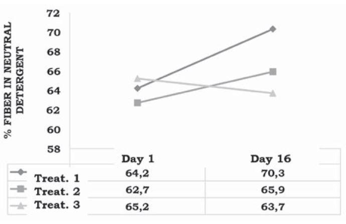 Neutral detergent fiber (Table 5) showed highly significant differences (P < .01) between treatments and time; similarly, significance was observed for their interaction (P < .01), its content increased the first 16 days (Figure 2) for EM treatment. In the control treatment, a higher NDF value was observed in day 16 (70.3 %), in relation to other treatments with additives (EM and kumis, 65.9 and 63.7 % respectively).