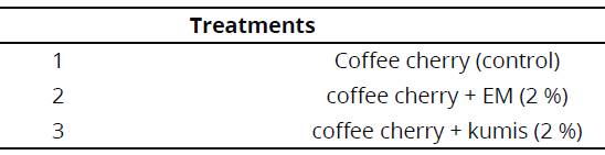 Micro silos with cherry of coffee were elaborated taking 22.5 kg of cherry that were divided into 45 bags of 500 g according to each treatment: i) a control treatment with coffee cherry; and two experimental treatments with additives: i) cherry + efficient microorganisms (EM); ii) cherry + commercial kumis. Each treatment had three replicates.