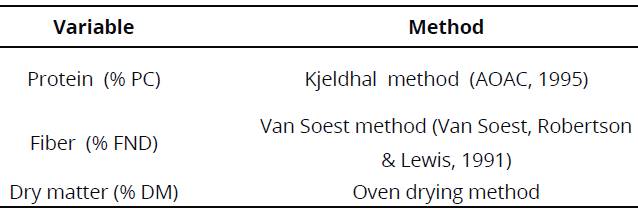 The experimental period lasted 31 days and samples were taken thrice on days 1, 16 and 31, corresponding to the fermentation period for nutritional composition analyzes (Table 2); every sampling day dry matter (DM) content was established using the oven drying method; then, each sample was passed through a micro mill to reduce particle size for subsequent crude protein (PC) analysis using the Kjeldahl method, and neutral detergent fiber (NDF) measure applying the Van Soest method. Analyzes were carried out in the Animal Nutrition Laboratory of Universidad Libre, Socorro Campus.