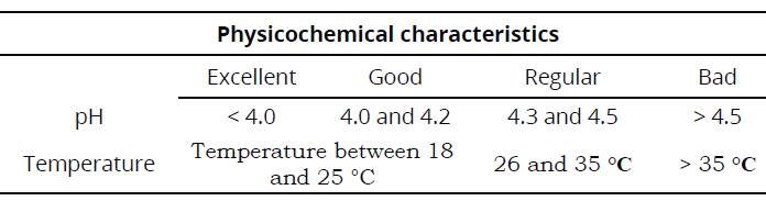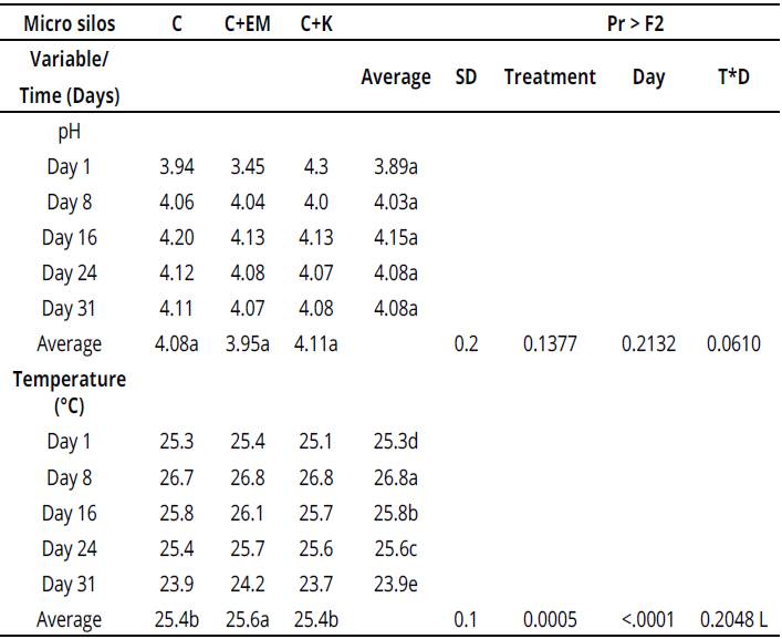 Likewise, pH values obtained in this research were lower than those reported for coffee pulp silage (3.8) by Ramírez et al. (2002) and Cárdenas (2003), cited by Villalba et al. (2011), in mixed silages. According to Díaz, Rodríguez & Salinas (2014), in "this process it is important to promote an environment with a pH of up to 4.2, which inhibits the growth of pathogens and retains nutritional characteristics of the silage product." According to Merensalmi and Virkki (1991), cited by Bezabih & Tamir (2014), pH required for silage stability at 150 and 250 g.DM-1.kg-1 is 4.10 and 4.35, respectively. Furthermore, pH is an indicators of silage quality, and in this research, the value found was approximately 4.08, a factor that was closely related to dry matter content of the micro silos (206 g.DM^.kg-1 that represents 20.6 %). Likewise, the temperature values found showed values within the range estimated as good (between 18 and 25 °C) according to Betancourt (2001), cited by Villalba et al. (2011). It is important to note that the suitable temperature for lactic acid bacteria growth provided in the additives for the treatments is between 25 and 40 °C (Elferink et al., 2000).