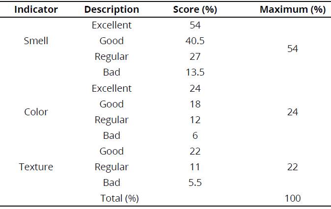 To evaluate organoleptic characteristics (Table 4), the Vallejo methodology was used (1995) cited by Aguilar, (2012); in this methodology, indicators were used; a numerical value was given to each indicator (color, smell and texture), obtaining at the end, the sum of organoleptic indicators (OI). The evaluation was carried out on the 31st fermentation day.