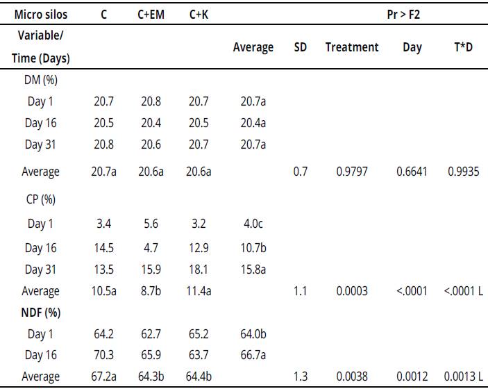 DM: dry matter; CP: crude protein; NDF: neutral detergent fiber; C: silage with coffee cherry; C + EM: silage with coffee cherry and efficient microorganisms; C+K: silage with coffee cherry and kumis; T*D: interaction between treatment and days. L: Linear effect of time on the physicochemical variables of micro silos, a, b and c: Rowswith different letters differsignificantlyat Ρ < .05; SD: standard deviation