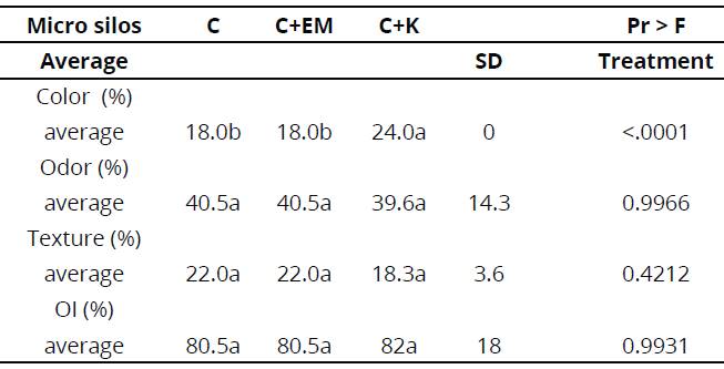 Additionally, when evaluating organoleptic indicators (OI) these showed good results for the three parameters (color, texture and smell). Villalba et al. (2011), reported a regular smell in coffee cherry silages, and regarding color, they mentioned that their silage quality was good, regardless of the raw materials used in their treatments.