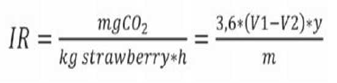 In the determination of respiratory intensity a Vernier breatharometer LABQUESTTM was used. An initial calibration was made bringing the equipment to 380 ppm of CO2, for 2 minutes, strawberry samples were taking into account their weight in grams and the occupied volume, subsequently, they were placed into a closed chamber of the equipment and measurement is carried out. To determine the respiratory intensity (ratio of CO2 in kilograms of strawberry per hour) equation 2 is used.