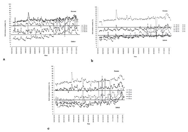 Volumetric moisture dynamics in the soil profiles of arrangements [A], [B] and [C] revealed variations both vertically along the profile and across evaluated periods. The latter corresponded to the dry (July - August - September) and rainy (October-November) seasons of 2015 (Figure 2).