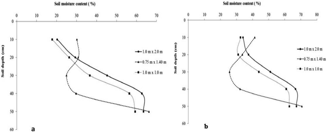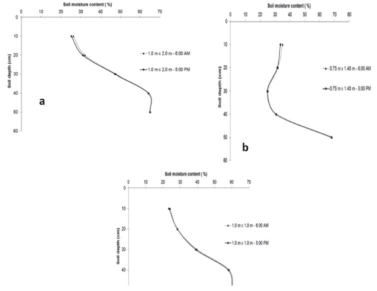 Soil moisture content showed the same pattern of behavior under the three planting densities, but varied across soil depths.