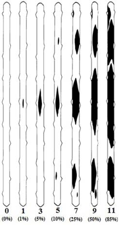 Figura 1: Escala de severidad de antracnosis propuesto y utilizado, para tallos de mora inoculados con discos de agar (modificado de López et al., 2013). 0: Sin lesión aparente o 0% del tejido afectado. 1: 1% del tejido afectado. 3: 5% del tejido afectado. 5: 10% del tejido afectado. 7: 25% del tejido. 9: 50% del tejido afectado. 11: 85% del tejido afectado. C.I. Tibaitatá, AGROSAVIA (antes CORPOICA), Colombia.