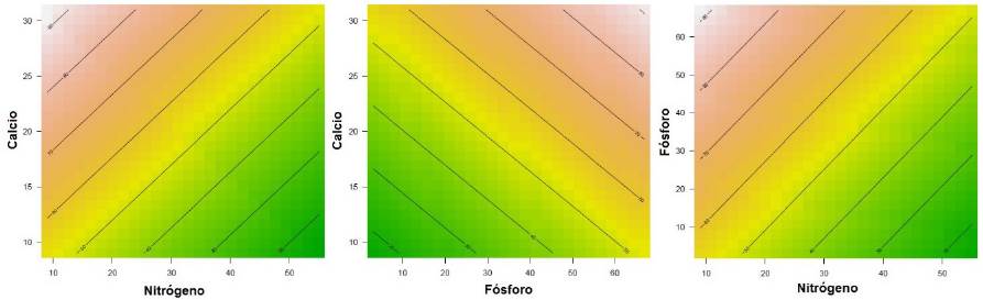 Figura 5: Gráfica de contornos para el modelo lineal múltiple del efecto de N, P y Ca sobre el porcentaje de severidad de C.gloeoporioides cepa-52 en tallos de mora. C.I. Tibaitatá, AGROSAVIA (antes CORPOICA), Colombia.