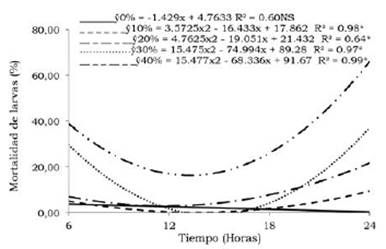 La sobrevivencia y la mortalidad de larvas presentaron un comportamiento lineal (P > 0.05) para el testigo y cuadrático (P < 0.05) para las demás concentraciones de J. curcas durante las 24 horas de evaluación. En la concentración de 40% de resina de J. curcas se observó mayor mortalidad de larvas a partir de 17 horas, alcanzando al final de la evaluación un valor máximo de 67% (Figura 6). Cuando no se aplicó resina en el control de larvas éstas presentaron una sobrevivencia de 100% al final de 24 horas de evaluación (Figura 7).