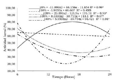 Con excepción de la concentración de 10% de resina, que mostró una tendencia lineal (P > 0.05) (Figura 8), la actividad larval (%) presentó una tendencia cuadrática (P < 0.05) para todas las concentraciones evaluadas. Por otra parte, se observó que las larvas en el tratamiento sin resina (testigo) presentaron mayor actividad durante el tiempo de monitoreo, hasta alcanzar su punto máximo de 80% a 17 horas de evaluación. En la misma Figura 8 se observa que en la concentración de resina de 10% la actividad larval fue alta y constante durante 24 horas de evaluación con un promedio de 61.9%, lo que indica que las concentraciones bajas no disminuyen el ataque de larvas de H. grandella en las hojas de S. macrophylla. Por otra parte, se observó que en la concentración de 20% ocurrió una alta actividad larval (78%) en las primeras horas de evaluación, para posteriormente disminuir hasta 20% a 15 horas; no obstante a partir de esta hora la actividad larval aumentó, por tanto, se puede afirmar que la acción insecticida de esta concentración no fue suficiente para disminuir la severidad de H. grandella. En las concentraciones de 30% y 40% la actividad larval disminuyó durante el periodo de evaluación.