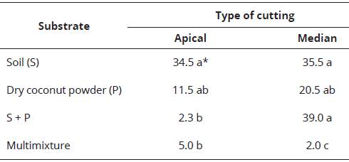 For the leaf persistence variable, it was observed that for the apical stem type the soil substrate was the one that differed statistically from the others, revealing the best result, while the multimixture and soil mixed with coconut poder showed lower results. For the median cutting type, the soil and soil substrates mixed with dry coconut powder did not differ statistically from each other, showing better results. However, the multimixture differed from the other substrates, revealing lower results (Table 4).