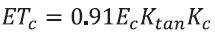 Estos recipientes se ubicaron sobre una plataforma de 10 cm de altura y fueron protegidos con malla para evitar el ingreso de animales. Las mediciones bajo la concepción de la metodología del tanque clase A se realizaron considerando que en los recipientes plásticos se produce una evaporación 9% mayor que en el tanque antes mencionado (Torres y Cruz, 1995), cuyas dimensiones estándar son 120.7 cm de diámetro y 25 cm de altura (Allen, et al., 2006). Por tanto, la evapotranspiración del cultivo (ET c ), conteniendo axiomáticamente a la evapotranspiración de referencia (ET o ), según el método del tanque evaporímetro, fue establecida por la ecuación 2, en donde K tan es un coeficiente tabular del tanque que depende de la velocidad del viento, de la humedad relativa, del tipo de cubierta alrededor del tanque y de la distancia del cultivo a barlovento (Allen, et al., 2006).