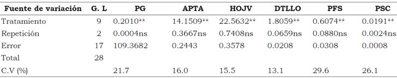 *P < 0.05; **P < 0.01; ns = no significativo; G.L = grados de libertad; PG = porcentaje de germinación; APTA = altura de planta; HOJV = hojas verdaderas; DTLLO = diámetro de tallo; PFS = peso fresco; PSC = peso seco; C.V(%) = coeficiente de variación.