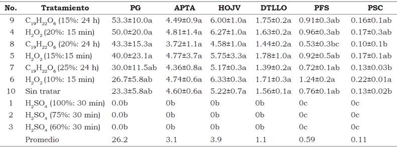 Los tratamientos con inmersión en H2O2 a 20 y 15% aumentaron el porcentaje de germinación, pero fueron inferiores en 3.3% al alcanzado con C19H22O6. El efecto positivo de H2O2 sobre la germinación de la semilla se explica por la liberación de O2 que acelera la respiración mitocondrial y las actividades metabólicas (Katzman et al., 2001). En contraste, en este estudio la presencia de H2SO4 produjo un efecto negativo sobre la germinación en semillas de C. pubescens, como resultado del rompimiento de la cubierta seminal y consecuente destrucción del embrión, lo que difiere con resultados obtenido en otros estudios.