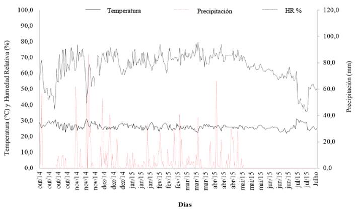 Figura 1: Temperatura (°C), humedad relativa del aire (%) y precipitación pluvial (mm) durante el período de realización del experimento. Gurupi - TO, 2015 (Fuente: INMET).
