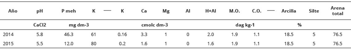 Tabla 1: Atributos químicos y granulometría del suelo utilizado en el experimento, entre los años 2014 y 2015 en clima tropical semi-húmedo.