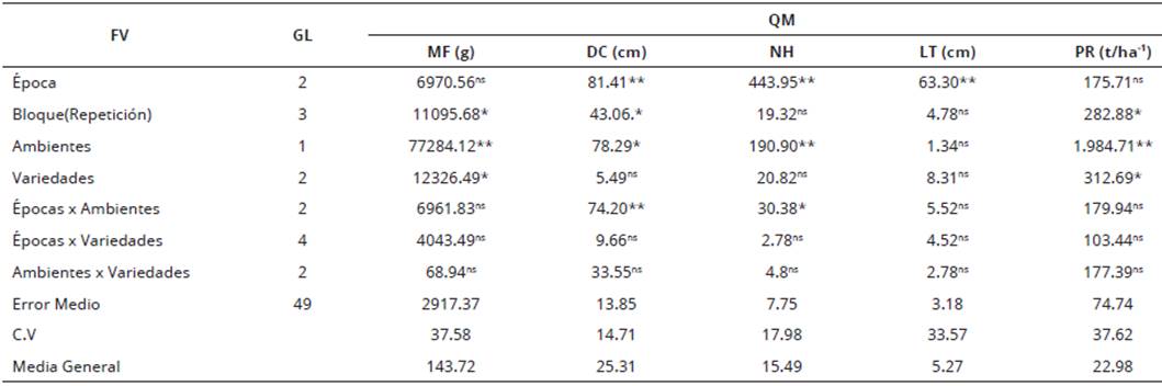 El análisis de varianza mostró efectos significativos (P < 0.05) de las épocas de siembra, los ambientes y las variedades en todas las características evaluadas (Tabla 2). No obstante, no se encontró efecto en las interacciones para la característica biomasa de la parte aérea (Tabla 3). Las características diámetro de la cabeza y número de hojas mostraron efecto significativo (P < 0.05) de la época y el ambiente, mientras la primera fue afectada por la interacción época x variedad, la segunda lo fue por época x ambiente. La producción fue afectada (P < 0.05) por el ambiente y la variedad y la longitud de tallo por la época de cultivo. Souza et al. (2008) trabajando con plantas de lechugas resistentes al calor en Vitória de Santo Antao - PB, encontraron que las características más afectadas por el ambiente fueron la longitud de tallo y la producción temprana de brotes reproductivos.