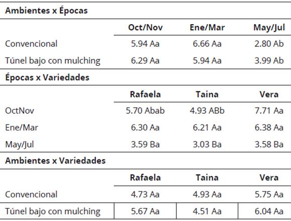 Para productividad, en la interacción ambientes por épocas de plantación (Tabla 7), no existió diferencia significativa entre las tres épocas en el cultivo convencional. Mientras que para el cultivo de túnel bajo con mulching obtuvo resultados elevados en los periodos de octubre a noviembre y de mayo a julio.