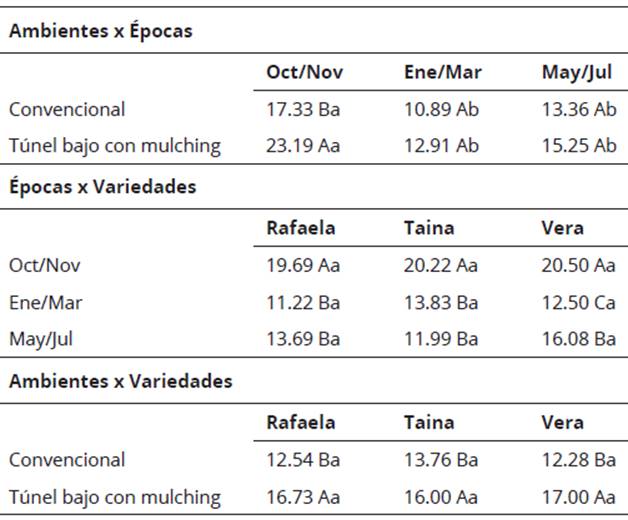 En la interacción ambiente x variedad, no hubo diferencia significativa entre las variedades evaluadas, en los sistemas de cultivo convencional y cultivo de túnel bajo con mulching. Las variedades Taina® y Vera® no se diferenciaron estadísticamente y presentaron superioridad sobre la variedad Rafaela®, esto por el hecho de que la variedad Vera® se desarrolló con caracteres de resistencia al florecimiento y para ser más tolerante a temperaturas más elevadas (Vecchia et al., 1999; Blat et al., 2010).