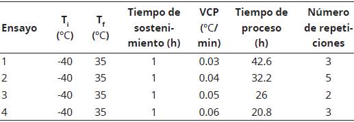El material vegetal fue enfriado desde 25 °C hasta -40 °C, a una velocidad de 0.22 °C/min. El proceso de liofilización se optimizó utilizando la metodología de superficie de respuesta con un diseño experimental Optimal, donde el número de repeticiones obedece al algoritmo matemático que emplea el método para modelar condiciones óptimas, así como economizar dinero, disminuir el tiempo y el número de las mismas (Huertas- Garcia, Gázquez-Abad, Martínez-López, y Esteban-Millat, 2013) en función unifactorial de la velocidad de calentamiento de la placa (0.03 - 0.06 °C/min) como se especifica en la Tabla 1. La velocidad de calentamiento de la placa se establece para cada experimento desde el sistema de control del equipo. Las variables dependientes fueron: humedad, actividad de agua, actividad antioxidante (DPPH y polifenoles totales) y color. Los resultados fueron analizados mediante el Software Design Expert® 8.0 (Stat-Ease, Inc. Minneapolis, USA). Después de encontrar las condiciones óptimas de proceso, se procedió a realizar la liofilización usando esas mismas variables para comparar los valores arrojados por el modelo con datos experimentales.