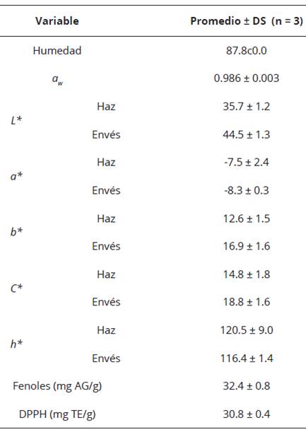 Como era de esperar, se observó que la actividad del agua aw de la planta fresca (ver Tabla 2) favorece el crecimiento de microorganismos. Los resultados de color para las hojas frescas permitieron identificar que el haz tiende a ser más oscuro, con mayor cromaticidad amarilla, menor saturación y un tono o matiz más verdoso, que el envés. No obstante, la cromaticidad verdosa no presentó diferencias (P > 0.05) entre ambos lados de la hoja.