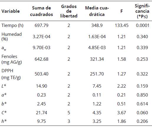 En la Tabla 3 aparecen los valores promedio y las desviaciones estándar de las variables dependientes consideradas en el diseño experimental del proceso LIO de A. drancunculus, en función de la VCP; y en la Tabla 4 los resultados del ANOVA de la optimización del proceso LIO. Las muestras LIO no presentaron significancia estadística (P > 0.05) en contenido de humedad, aw, L*, a*, b*, C* y h* con respecto al factor VCP, pero sí (P < 0.05) en el tiempo de secado con respecto a dicho factor y a su interacción cuadrática. El tiempo de secado representa una variable de respuesta de importancia en los procesos LIO, ya que influye directamente en los costos de producción, debido al gasto energético que implica (Lopez-Quiroga, Antelo, y Alonso, 2012).