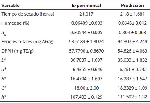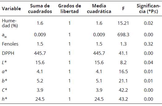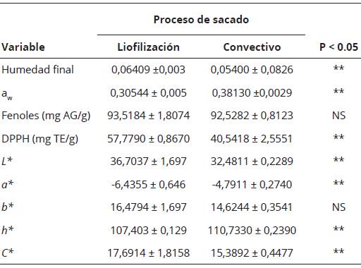 En la Tabla 6 se incluyen los resultados de la comparación entre los métodos de deshidratación por liofilización y por convección, y en la Tabla 7 los valores promedio y las desviaciones estándar de los atributos de calidad (variables respuesta) de las hojas deshidratadas de A. drancunculus por LIO en las condiciones óptimas y por secado mediante convección (SC). Se presentaron diferencias (P < 0.05) entre ambos procesos para las variables humedad, aw, DPPH, L*, a*, C*, h* y la cromaticidad b*, lo que no se observó para el contenido de fenoles totales.