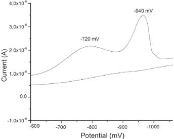 Figure 1: Sweep polarograms of chlorpyrifos. Standard of CP for the potential of electroactivity, the analyte had two signals: -720 and -940 mV. The second polarogram corresponds to blank.