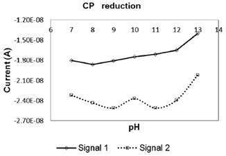 The CP in the reduction process generates two species and each generates a respective signal. The first signal occurs at-637.3 ± 32.3 mV and the second -795.6 ± 28.1 mV. The current carrying capacity of both species occurs at pH 13. The direction of the applied potential is negative- positive, indicating that the reaction is carried out cathodic i.e. electroactive species undergo a reduction process.