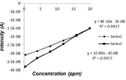 Graphed current generated (or response signal in Amps) versus concentration (ppm) obtaining the linearity range (Figure 3). CP polarographic presents two signals, the first signal defines better the polarographic wave, which has a lower standard deviation, which is determined for purposes of quantification of chlorpyrifos in natural samples and was made based on the first signal generated by the analyte.