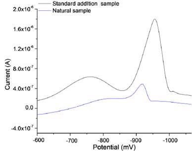 The validated method was applied to green and white onion extracts. The polarograms showed no signal. Solutions were made from the sample and every team assessed the response, choosing the solution 1:3 V: V (sample: ethanol). Later volumes were optimized sample and standard solution CP (3 ppm). The best response was obtained by adding to the cell 3mL of the polarographic standard, 3 mL of the electrolyte solution and 1 mL of the native sample (Figure 4).