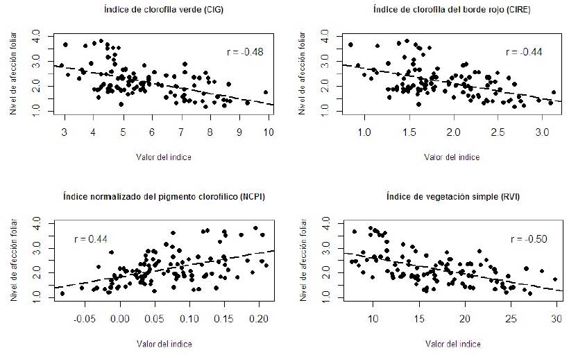 El índice vegetativo RVI presentó la mayor relación (r = -0.50) con el valor ponderado de daño RVI y una correlación negativa moderada. Los índices CIG y CIRE presentaron coeficientes de -0.48 y -0.44, respectivamente (Figura 2). Los índices NDVI y GNDVI, con mayor frecuencia de aparición en la literatura, presentaron en este estudio coeficientes bajos siendo, respectivamente, r = 0.11 y r = 0.10.