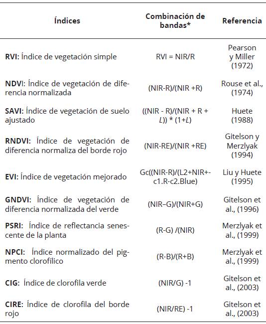 *Bandas, R (rojo), G(verde), B (azul), NIR (infla rojo cercano) y RE (borde rojo). L= 0.5, L2 =1, C1 = 6, C2 = 7.5 y Gc = 2.5.