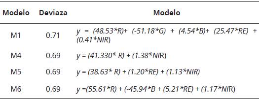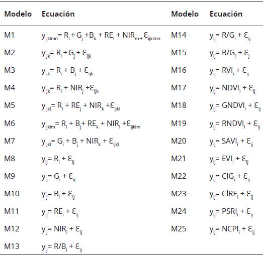 Se probaron 25 modelos lineales generalizados bajo una estructura de distribución de la familia quasi, empleando el comando glm de la librería stats del programa R-project (R Core team, 2018). Algunos modelos se construyeron por los índices vegetativos calculados, los modelos restantes son adiciones de las bandas R, G, B, RE y NIR (Tabla 2). Se seleccionaron los cuatro modelos con mayor Deviaza (estadístico de precisión de los modelos lineales generalizados) y se les aplicó un análisis de varianza con prueba de Fisher para determinar diferencias estadísticas entre ellos. Se diferenció el modelo de mayor precisión y el de mayor parsimonia.