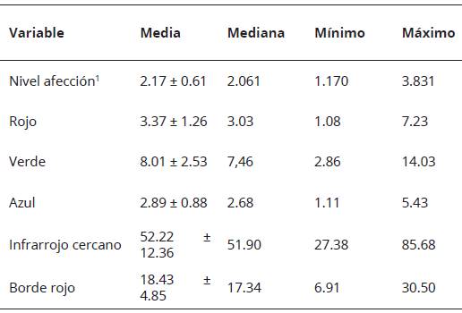 Se encontraron bajos valores de reflectancia en el espectro visible, especialmente en B y R, con valores de reflectancia de 2.89% ± 0.88% y 3.37% ± 1.26%, respectivamente. La longitud de onda G tuvo una reflectancia, promedio, de 8.01% ±2.53%, la RE de 18.43% ± 4.85% y la región del NIR tuvo el máximo valor de reflectividad con 52.22% ± 12.36% (Tabla 3). El valor promedio de daño por plagas encontrado en la pastura fue de 2.17, con niveles mínimos de 1.17 y máximos de 3.83.