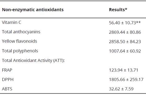 * Vitamin C, total anthocyanins and yellow flavonoids (mg/100g); Total polyphenols (mg EAG/100g); FRAP (μM ferrous sulphate/g fresh sample); DPPH (g/g EC 50); ABTS (μM trolox/g fresh sample). ** Mean values ± standard deviation of the mean determination in triplicate.