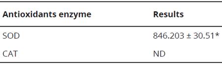 SOD (UA/g); CAT (μmol H2O2 mg-1 min-1 P). ND = Not detected. * Mean valúes ± standard deviation of the mean determination in triplicate.