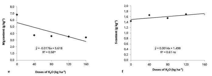 In addition, the decrease in the Mg content with the increasing doses of K2O also resulted from the competitive inhibition interaction existing between these two nutrients (Marschner, 2012). According to Ortega and Malavolta (2012)), competitive inhibition generally occurs with similar valence ions because they compete for the same absorption canal, reducing the absorption of those in a lower concentration in the soil solution. On the contrary, Ortega and Malavolta (2012) emphasize that the high Mg contents do not have the same effect on K. This is because K, due to its lower load, crosses the plasma membrane rapidly, reducing the absorption of the other cations.