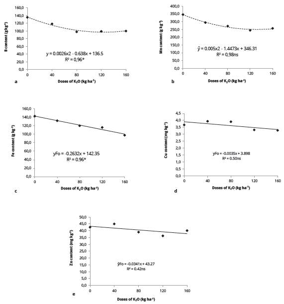 The B and Mn contents in leaves of M. dubia had a significant quadratic adjustment (P < 0.05) (Figure 3a and Figure 3b) in relation to the increase in the K doses. The maximum B content (Figure 3a) was 136.50 mg kg-1 in plants without potassium fertilization, decreasing up to 100.01 kg kg-1 at the dose of 160 kg ha-1 of K2O. The leaf Mn content in the studied plants (Figure 3b) had a significant variation in response to the increasing doses of K2O, reaching values of 346.24 and 248.00 mg kg-1 at the doses 0 and 160 kg ha-1, respectively.