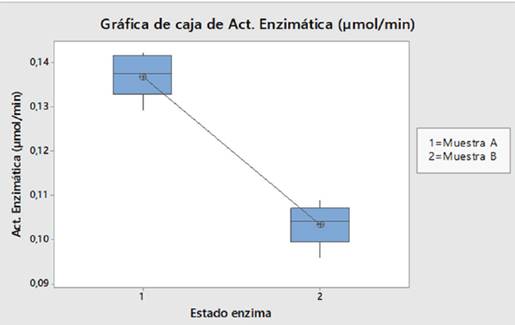 Finalmente, para comprobar la existencia de diferencia estadísticamente significativa entre las medias de las muestras se realizó una prueba paramétrica inferencial de dos colas, lo que se hizo mediante el test de Student para muestras independientes. En la Figura 10 se muestra el diagrama de cajas para la Muestra A y B. Se observa que la dispersión de las cajas de ambas muestras es similar, pero la media de la Muestra A es mayor que la media de la Muestra B. El valor P de la prueba de Student fue de 0.017, el cual es < 0.05, por lo que se rechaza la hipótesis nula a favor de la hipótesis alternativa la cual se afirma que: existen diferencias significativas entre la media de la actividad enzimática de la ß-D-fructofuranosidasa libre y la media de la actividad enzimática de la ß-D-fructofuranosidasa inmovilizada sobre NPM-CoFe204.