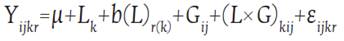 Donde: Yijk = variable de respuesta; = media general del experimento; Lk = efecto de la localidad k-ésima); b(L)r(k) efecto del bloque r-ésimo dentro de la localidad k-ésima; Gij = efecto de la cruza ij-ésima; (LxG)kij = efecto de la interacción de la localidad k-ésima por el genotipo o cruza i j-ésimo; = error experimental. El efecto de cruza Cij, se descompone en: