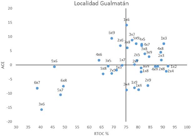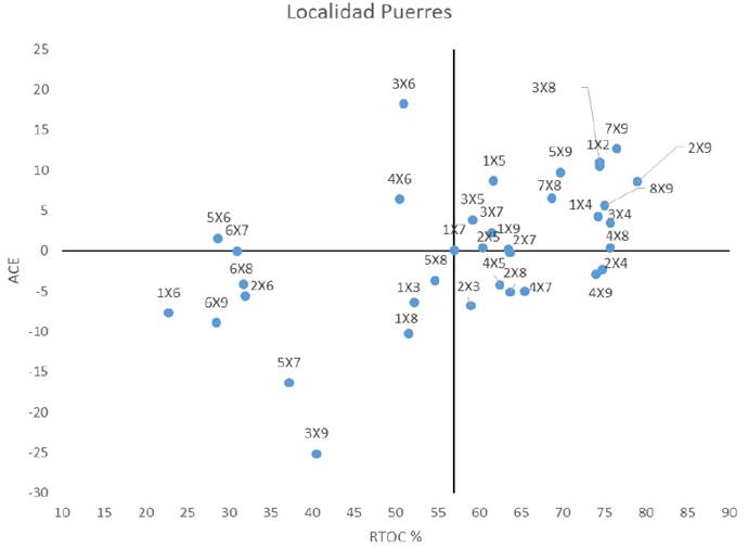 Las combinaciones que están en el cuadrante inferior izquierdo presentan efectos negativos en ACE; además, presentan rendimientos por debajo de la media general. Algunas cruzas con ACE negativa y significativa son 2x5, 6x9 y 8x9 presentaron valores en RTOA que van de 20.29 a 26.63 t/ha/año. Con relación a los genotipos que poseen efectos de ACE altos y positivos, su progenie representa una alternativa interesante para derivar familias, poblaciones o líneas, para programas de mejoramiento genético(Peña et al., 1998)