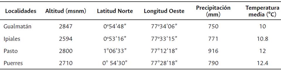 Localización. El estudio se realiza en dos periodos. En el primero, (Semestre A 2016) se siembran los parentales y los cruzamientos que conformaron el dialelico. Y en el segundo, (Semestre A y B 2017) se realiza la siembra de los híbridos en las cuatro localidades de estudio en el departamento de Nariño (Tabla 1).