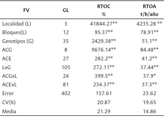 La interacción localidad por genotipos (LxG) es altamente significativa (p < 0.01) para RTOC y RTOA (Tabla 2), Esto indica que las medias de rendimiento no son estadísticamente iguales en los ambientes evaluados, en consecuencia hay una variación sustancial entre los materiales genéticos sobre los ambientes donde se desarrollan (Tirado et al., 2018; López-Morales et al., 2019). Esto reduce el progreso de la selección al ser una fuente de variación que sesga la mejor forma de selección de los genotipos superiores. También sugiere que los caracteres antes mencionados al ser afectados por el ambiente poseen herencia de tipo poligénica (De la Cruz, 2005).