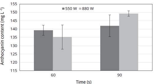 The highest CAT obtained with a solution of water plus ethyl alcohol 2% acidified was 149.29 ± 1.66 mg/L for a power of 880 W during 90 s; however, the second largest CAT was obtained with a power of 550 W and a time of 90 s (Figure 1). The most important influence is the time of application of the microwaves, since at a longer time a considerable concentration of anthocyanins was obtained. In another research work with anthocyanin extracts from purple cabbage, it was determined that the CAT decreases from 13.68 to 6.48 mg/100 g in anaerobic conditions and from 13.77 to 5.01 mg/100g in aerobic conditions, to the extent that the pH increases from 3.0 to 5.0 for increases in acidity, achieved with ascorbic acid in concentrations up to 200 mg/100 g (Walkowiak-Tomczak and Czapski. 2007). Work has been carried out where one of the variables of extraction is time, as it is in the case of obtaining anthocyanins from blueberries, where the highest extraction was at 5.3 minutes, decreasing significantly from this value due to the heat generated by the microwave equipment that helps the degradation of this type of bioactive compounds (Zheng et al., 2013).